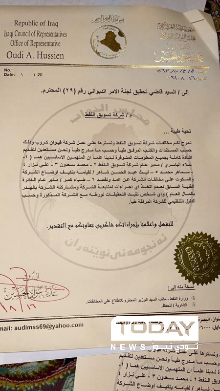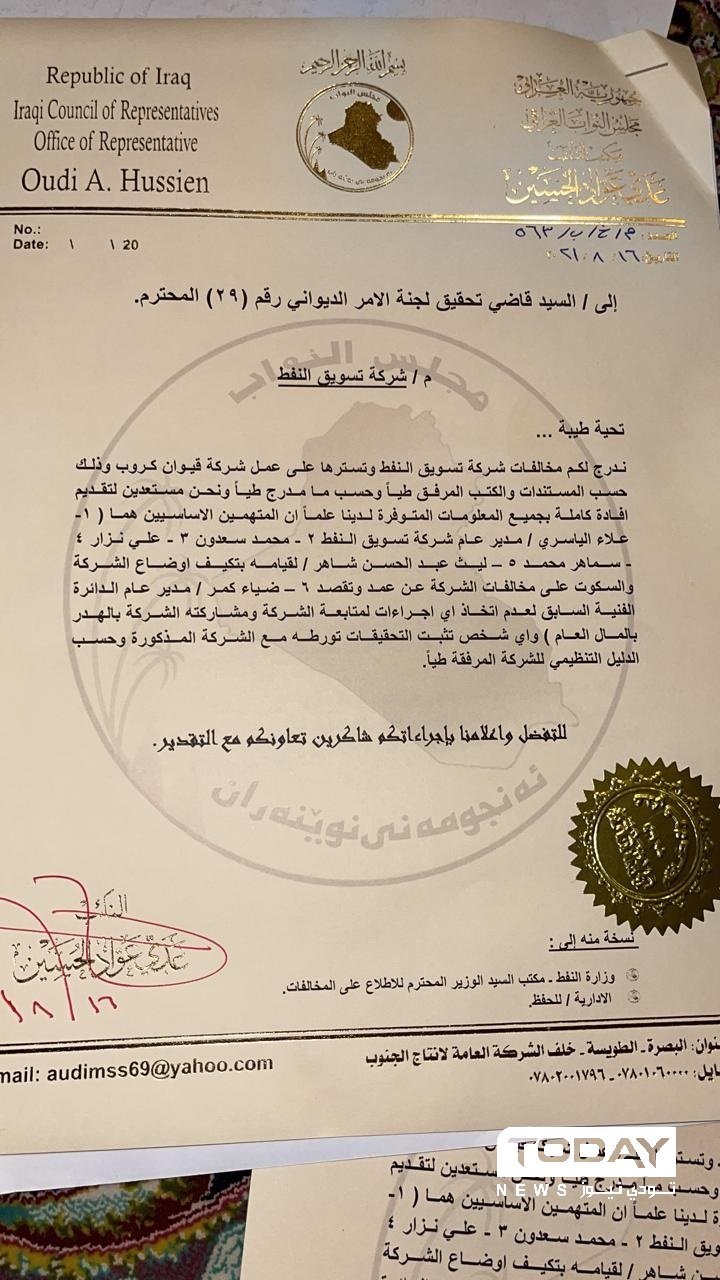 وبين التميمي تورط مدير عام شركة تسويق النفط قيامه يتكيف أوضاع الشركة والسكوت على مخالفات الشركة عن عمد وتقصد وطالب التميمي الجهات القضائية بمحاسبة أي شخص تثبت التحقيقات تورطه مع الشركة المتهمة ومن يحاول الهدر بالمال العام .