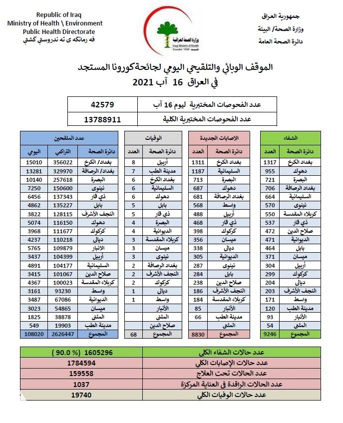 وأضاف البيان، أن "حالات الوفاة الجديدة بكورونا بلغت 56 حالة في عموم محافظات البلاد"، لافتا إلى أن "الاشخاص الذين تلقوا اللقاح خلال 24 ساعة بلغ عددهم 120830".