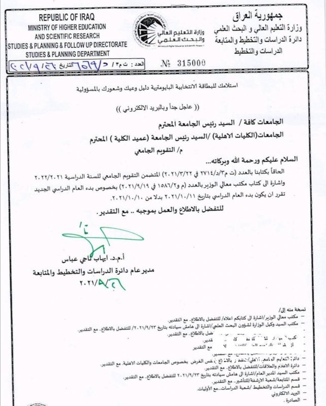 حددت وزارة التعليم العالي، موعد بدء العام الدراسي الجديد في الجامعات العراقية.