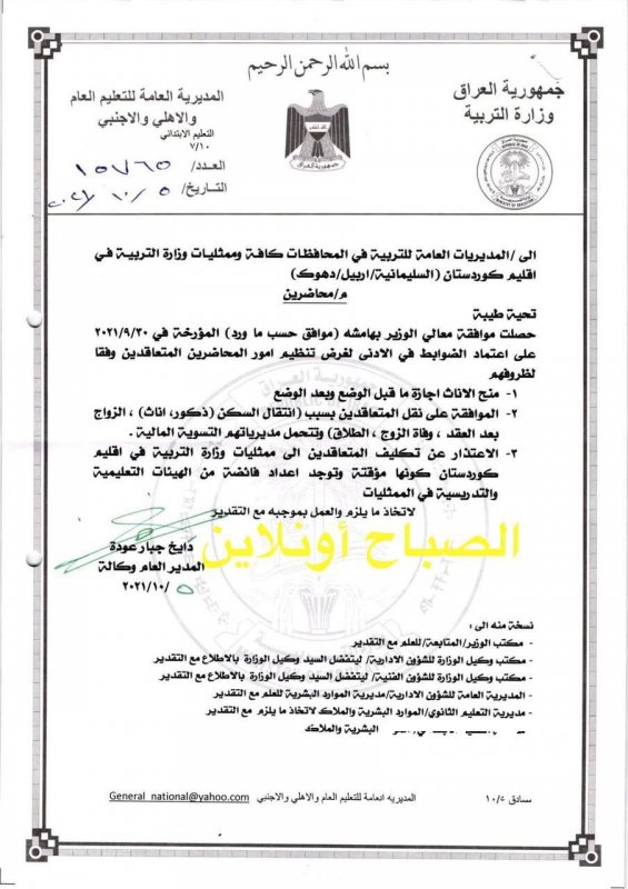 وبحسب وثيقة حصلت"Today News" على نسخة منها،، فقد وافق الوزير على منح الاناث اجازة ماقبل الوضع وبعد الوضع، الموافقة على نل المتقاعدي بسبب انتقال السكن، الاعتذار عن تكليف المتعاقدين إلى ممثليات وزارة التربية في اقليم كردستان كونها مؤقتة وتوجد اعداد فائضة".