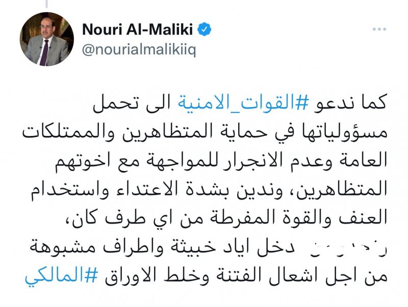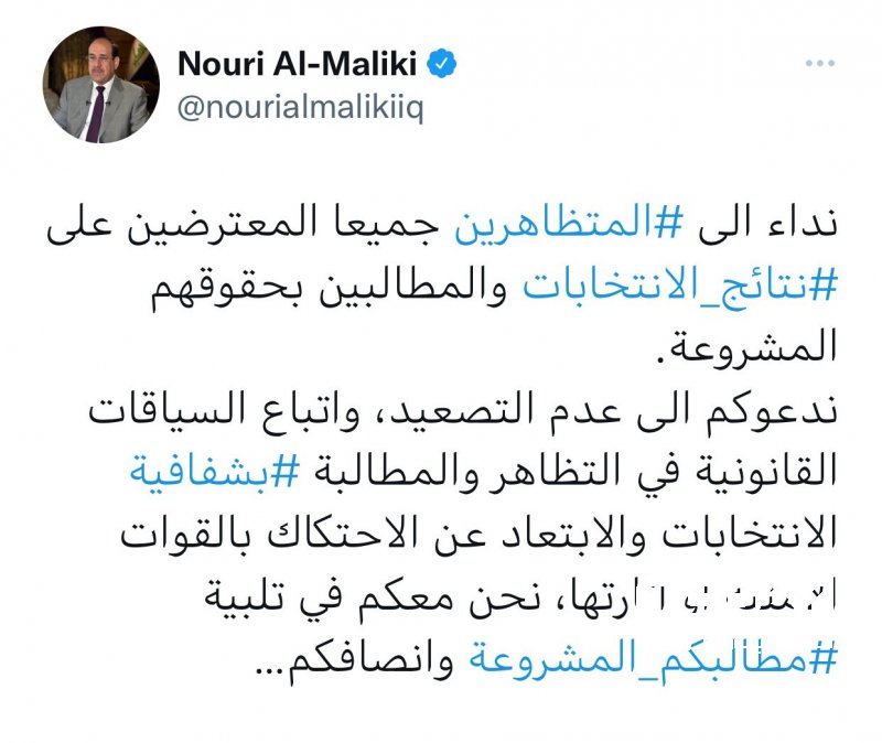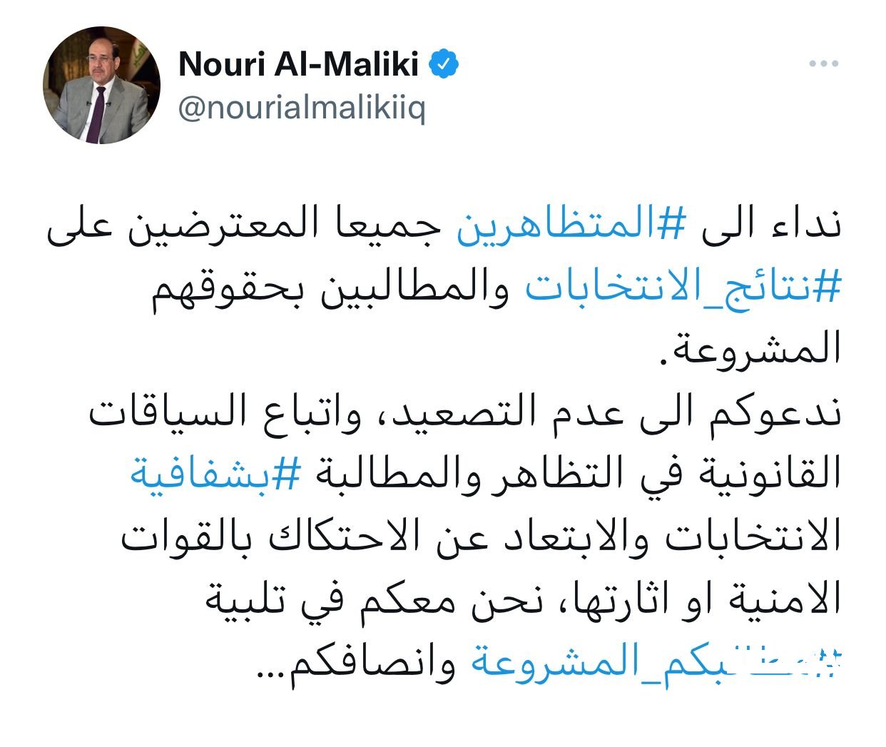 دعا زعيم أئتلاف دولة القانون نوري المالكي ، اليوم الجمعة ، المعترضين على نتائج الانتخابات لعدم التصعيد مطالبا القوات الأمنية بتحمل مسؤلياتها في حماية المتظاهرين والاملاك العامة محذرا من أياد خبيثة وأطراف مشبوهة تحاول اشعال فتنة .