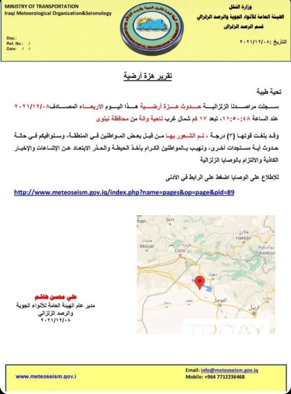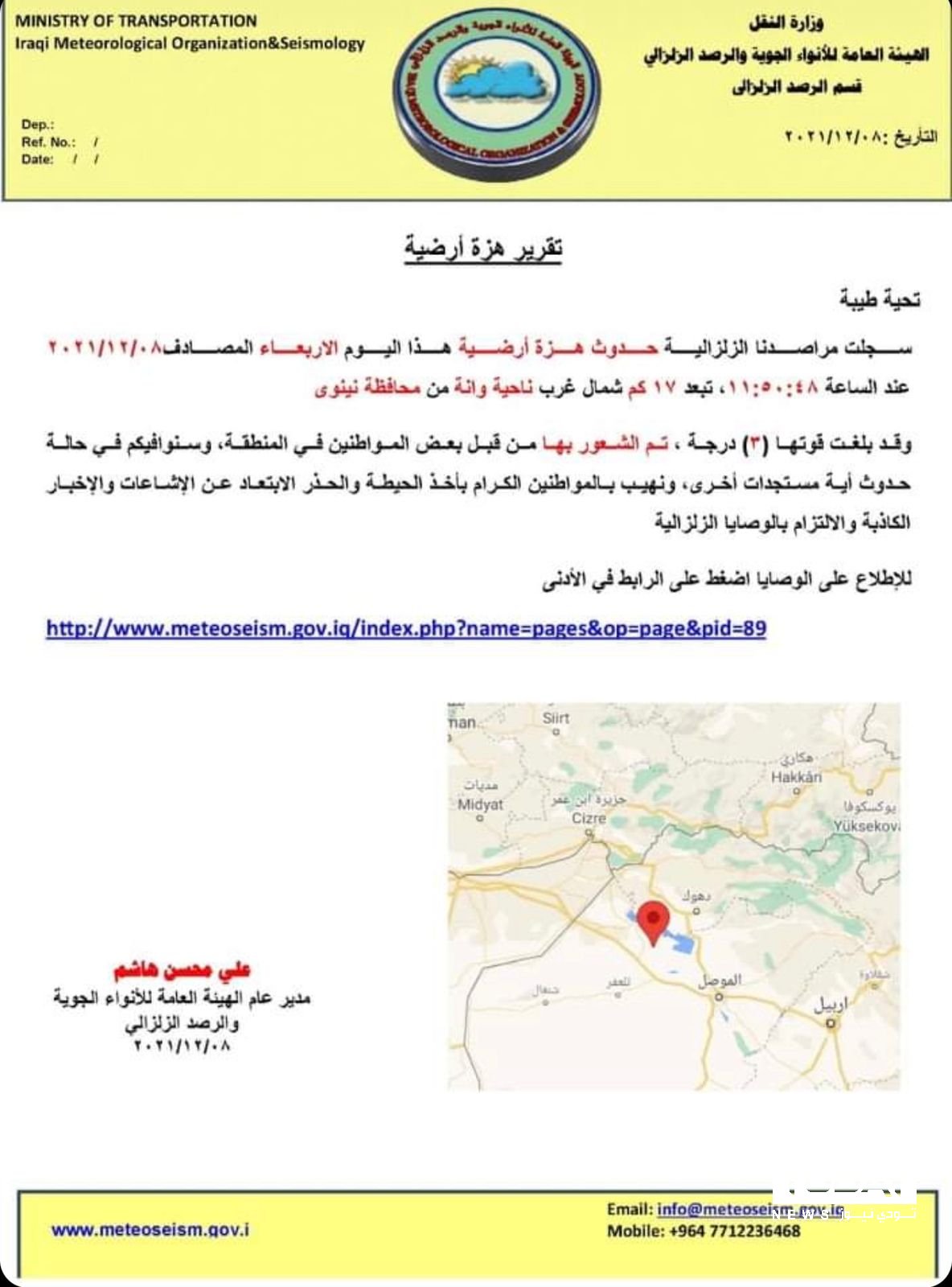 اعلنت وزارة النقل العراقية، اليوم الأربعاء، تسجيل مراصدها الزلزالية في الهيئة العامة للانواء الجوية والرصد الزلزالي حدوث هزة أرضية شمال غرب ناحية وانه في محافظة نينوى.