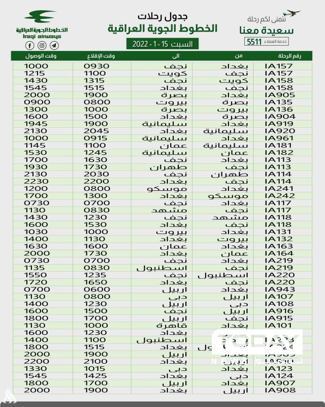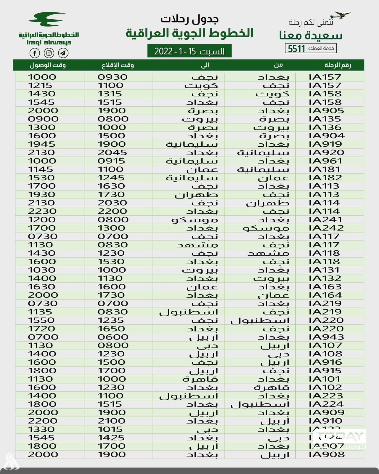 أعلنت الخطوط الجوية العراقية، اليوم الجمعة، عن جدول رحلاتها ليوم غد السبت.