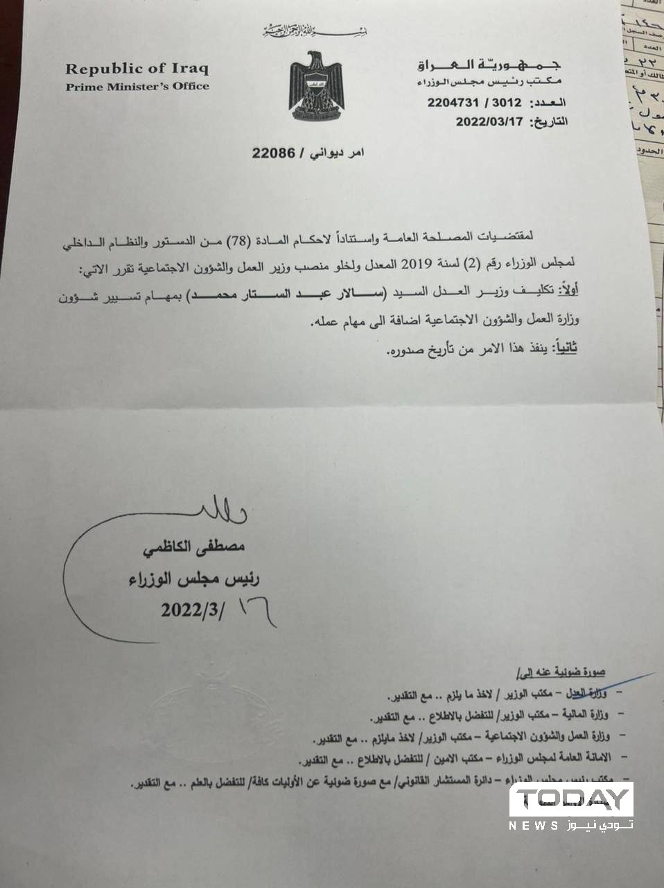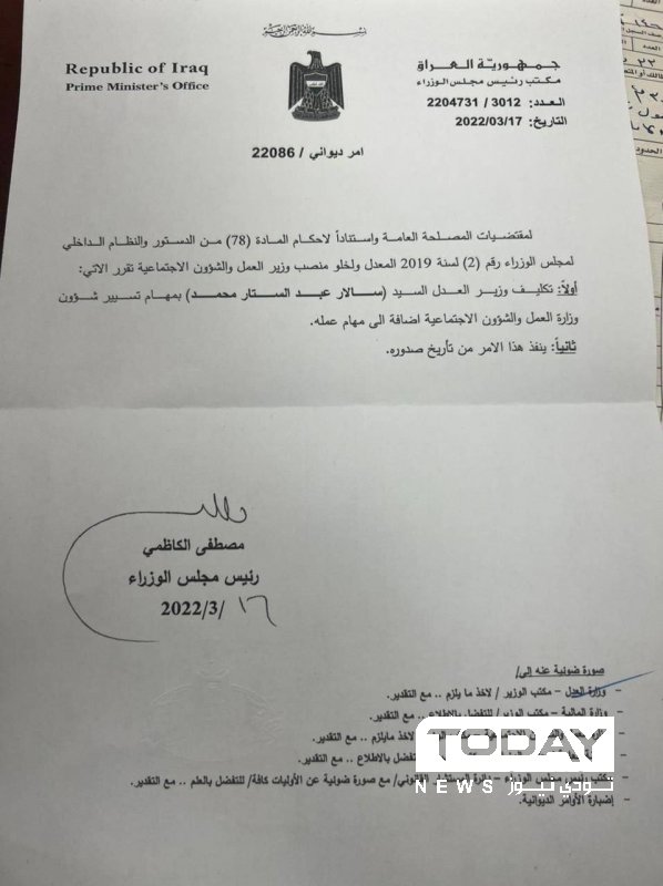 وبحسب وثيقة حصلت Today News على نسخة منها، فقد كلف وزير العدل سالار عبدالستار محمد بمهام بامر ديواني في مهام تسيير شؤون وزارة العمل والشؤون الاجتماعية اضافة إلى مهام عمله