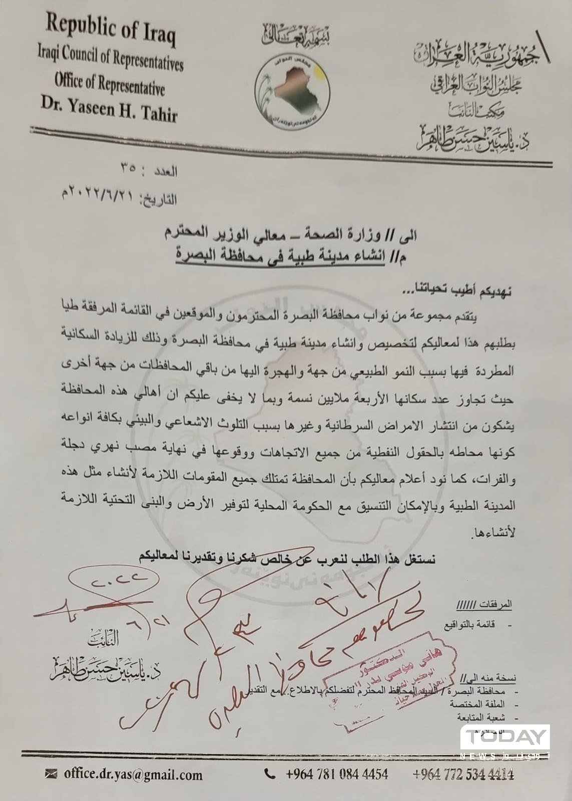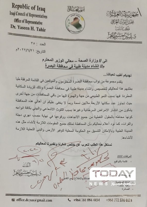 أعلن نواب البصرة، استحصال موافقة وزير الصحة على إنشاء مدينة طبية متكاملة في المحافظة