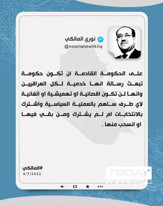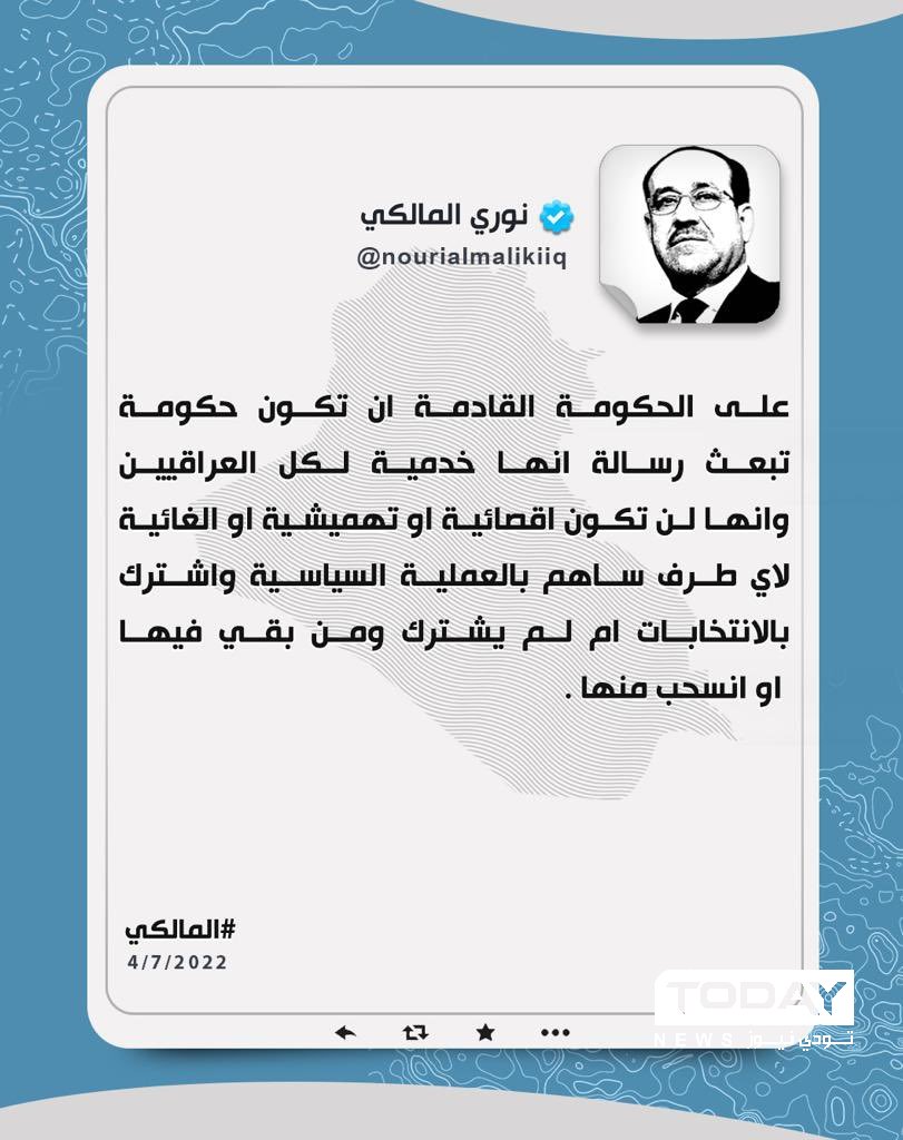 المالكي مغردا بخصوص الحكومة الجديدة .. "خدمية" لا اقصائية أو تهميشية
