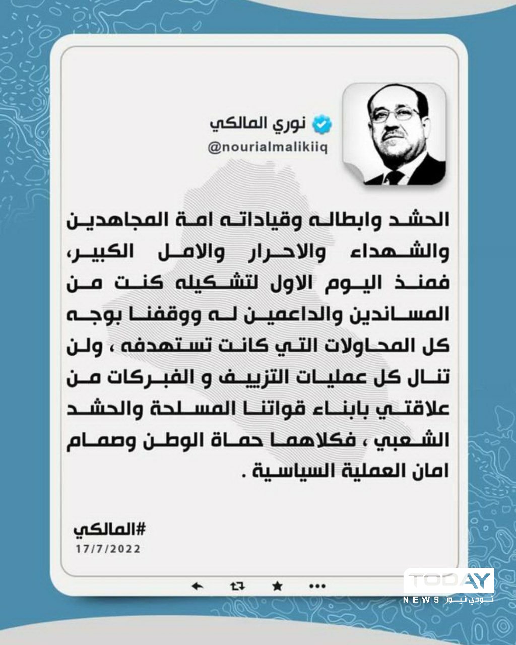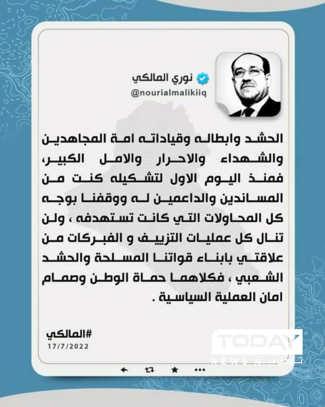 أكد زعيم ائتلاف دولة القانون نوري المالكي، اليوم الأحد ، ان الفبركات والتزييف لن تنال من علاقته بالقوات المسلحة والحشد الشعبي .