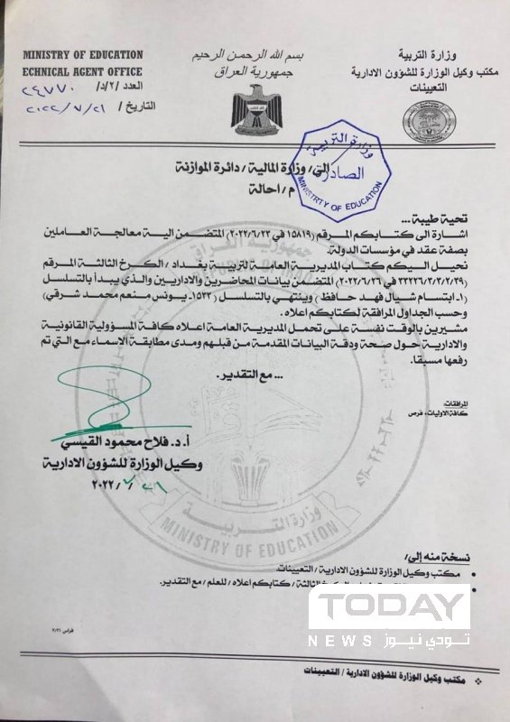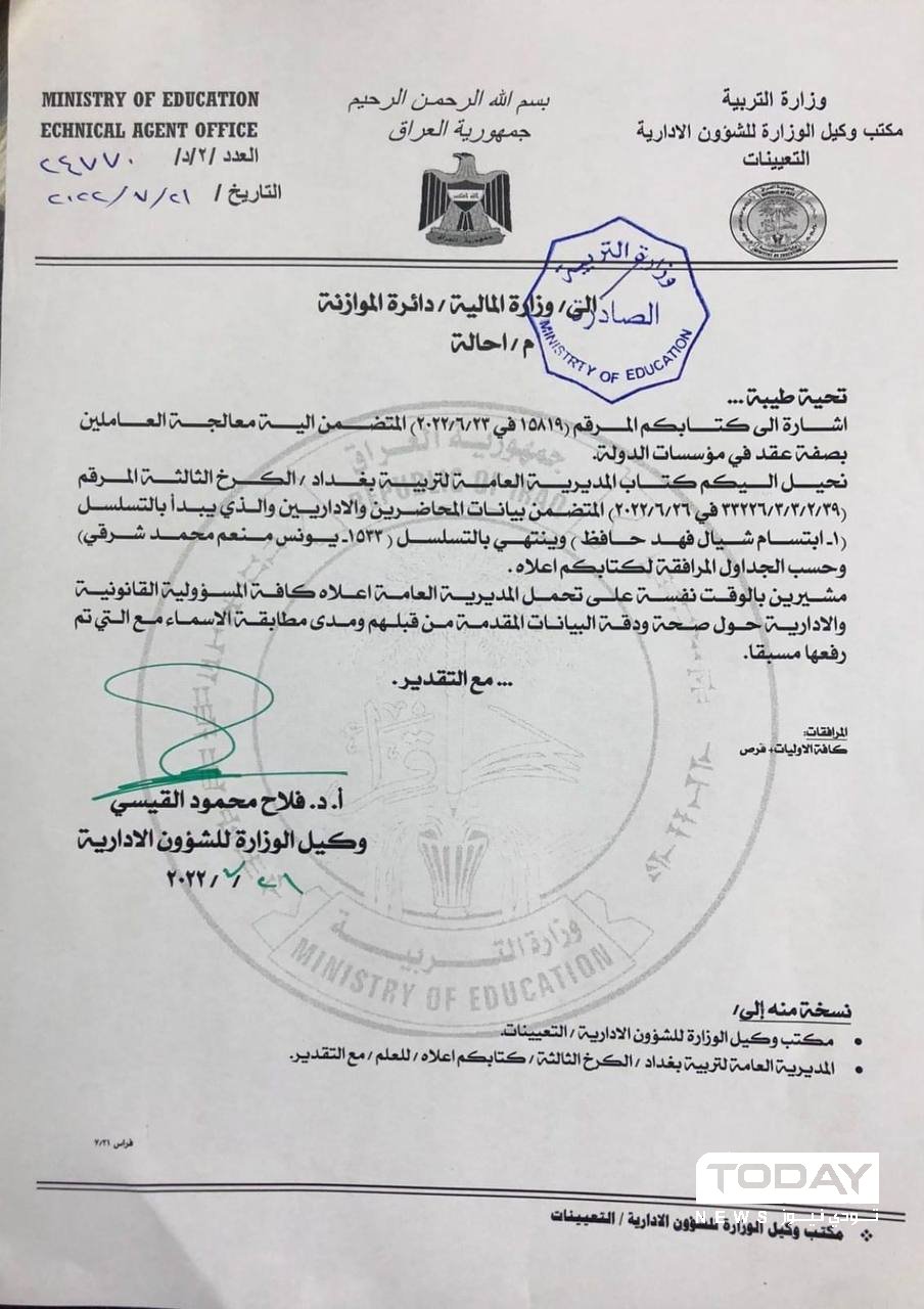 اعلنت وزارة التربية، اليوم الخميس، عن ارسال بيانات المحاضرين والاداريين في تربية الكرخ الثالثة إلى وزارة المالية.