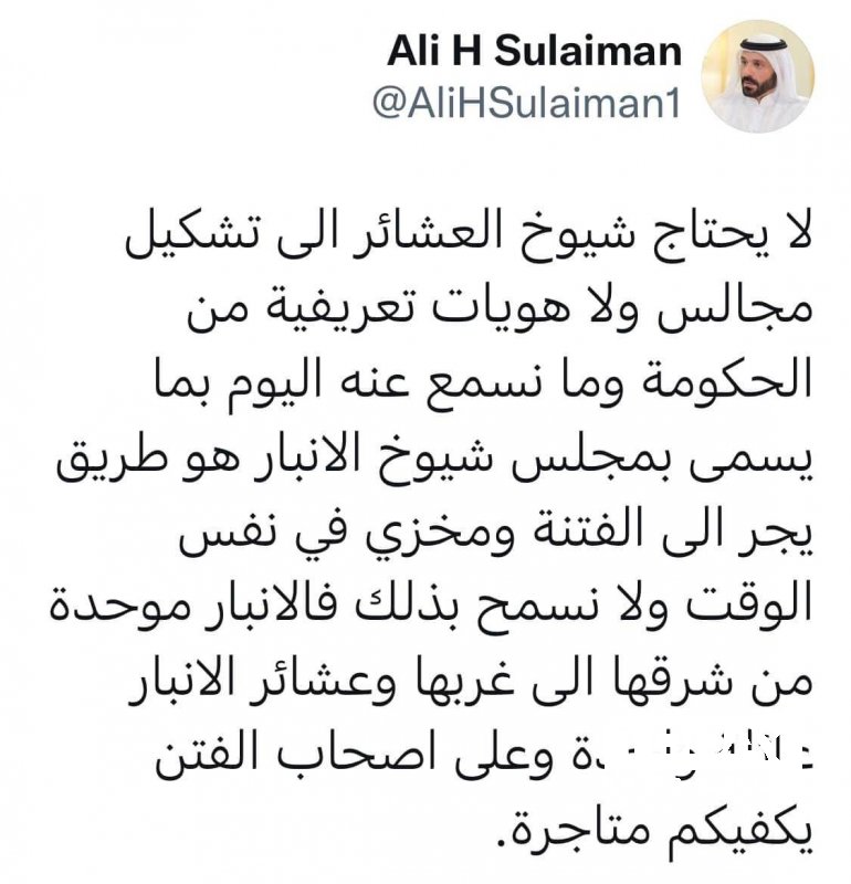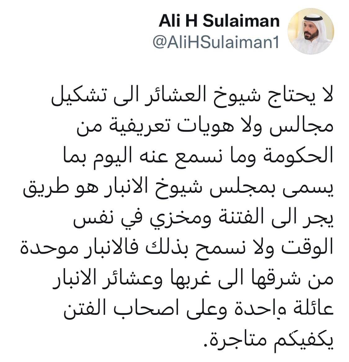 وقال سليمان في تغريدة عبر تويتر ،ان ما نسمع عنه اليوم بما يسمى بمجلس شيوخ الانبار هو طريق يجر الى الفتنة ومخزي في نفس الوقت ولا نسمح بذلك.