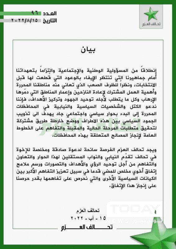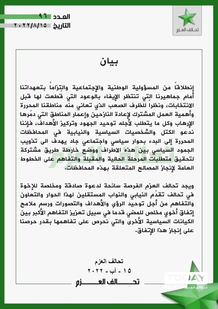 تحالف العزم يوجه رسالة بشأن المناطق المحررة