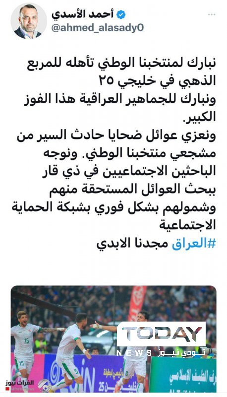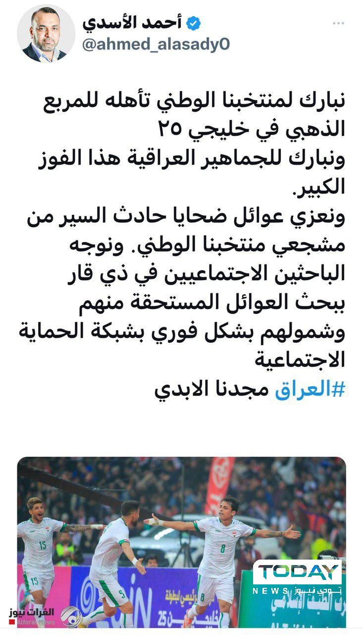 وجه وزير العمل والشؤون الاجتماعية، احمد الاسدي، وبشكل فوري، اليوم الاثنين، شمول عوائل ضحايا حادث السير بشبكة الحماية الاجتماعية للمستحقين منهم من مشجعي منتخبنا الوطني.
