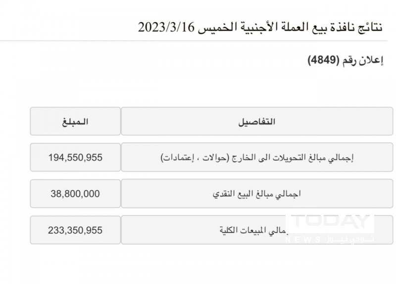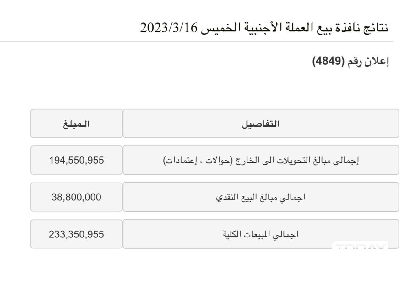 سجلت مبيعات البنك المركزي العراقي من الدولار في مزاد اليوم الخميس، أكثر من 233 مليون دولار.
