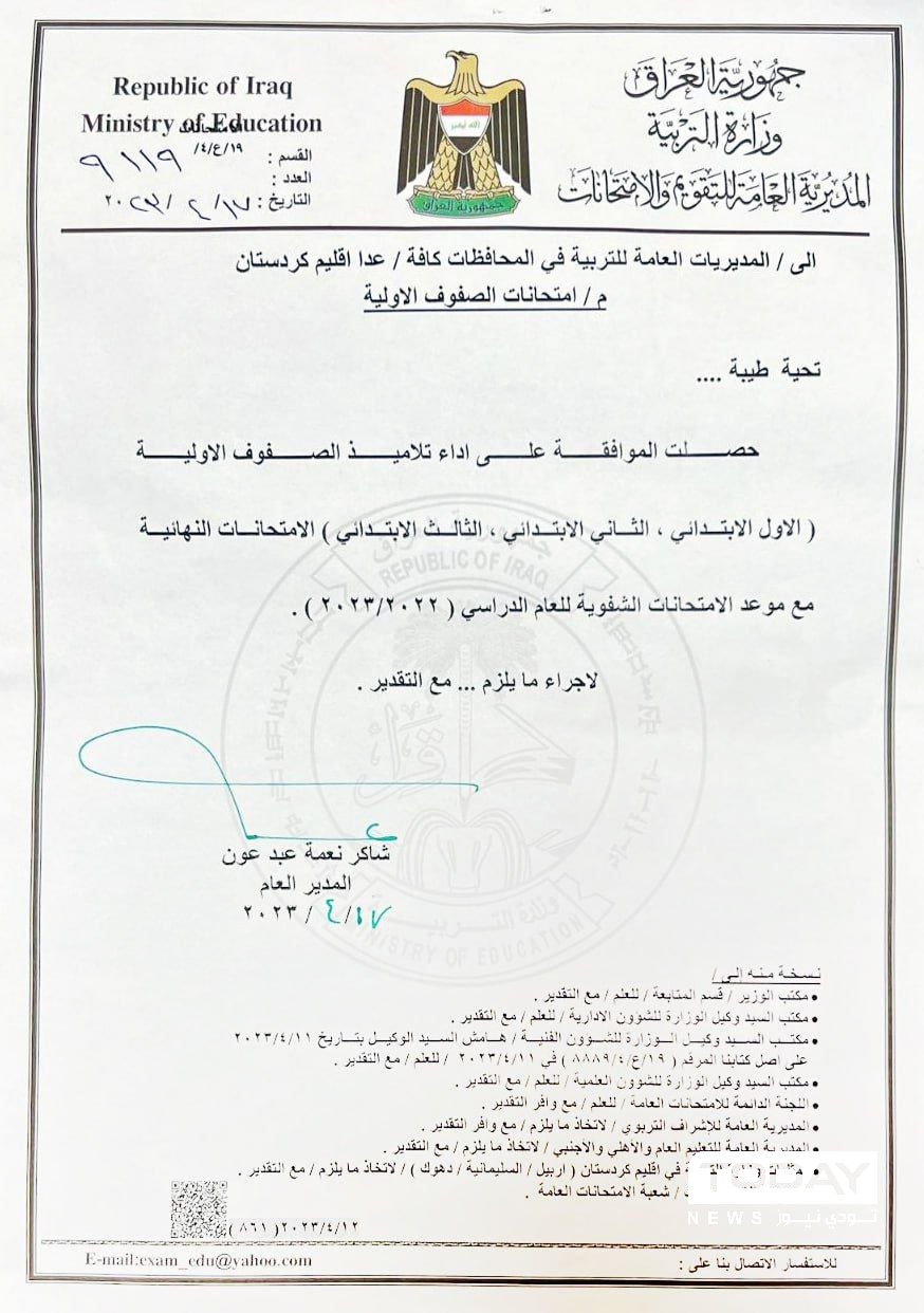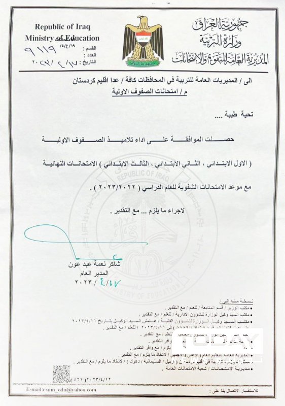 أصدرت المديرية العامة للتقويم والامتحانات في وزارة التربية، قراراً بالسماح لتلاميذ الصفوف الدراسية الأولية ( الأول والثاني والثالث الابتدائي)، بأداء الامتحانات النهائية بالتزامن مع موعد الإمتحانات الشفوية للعام الدراسي الحالي.