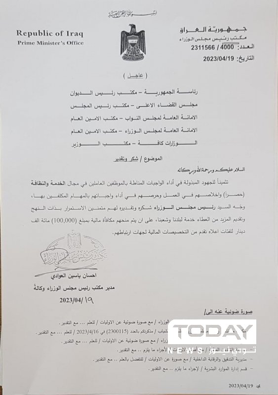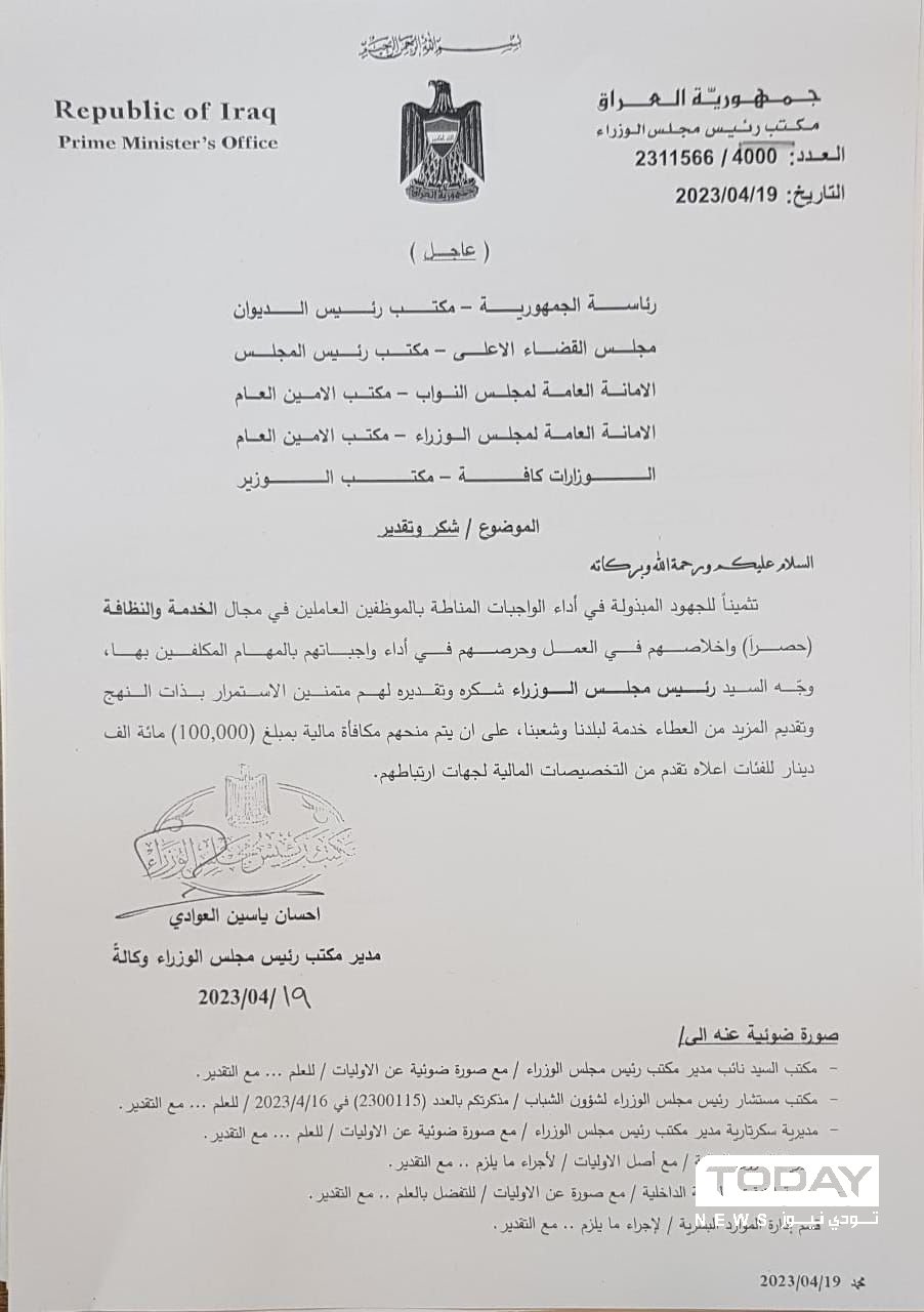 وجه رئيس مجلس الوزراء محمد شياع السوداني، اليوم الأربعاء، بمنح مكافأة مالية قدرها (100) الف دينار لعمال الخدمة والنظافة في الرئاسات الأربع والوزارات كافة، تثمينا لجهودهم.