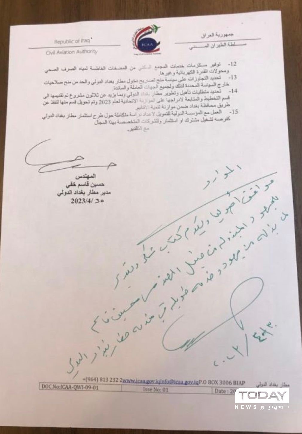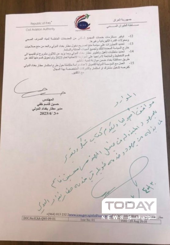 ووافقت سلطة الطيران المدني العراقي على طلب الإعفاء، ووجهت بتقديم كتاب شكر وتقدير لمدير مطار بغداد الدولي.