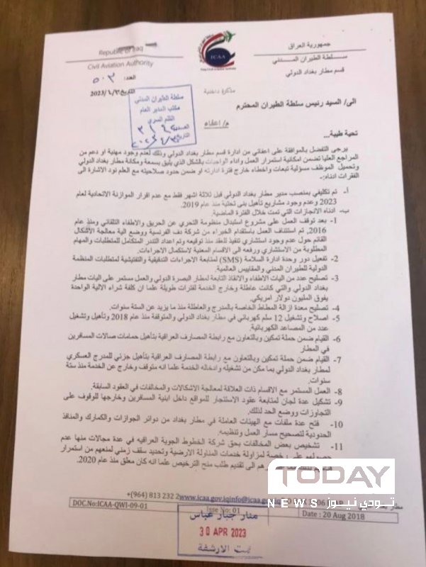 وثيقة .. إعفاء مدير مطار بغداد من منصبه بناءً على طلبه