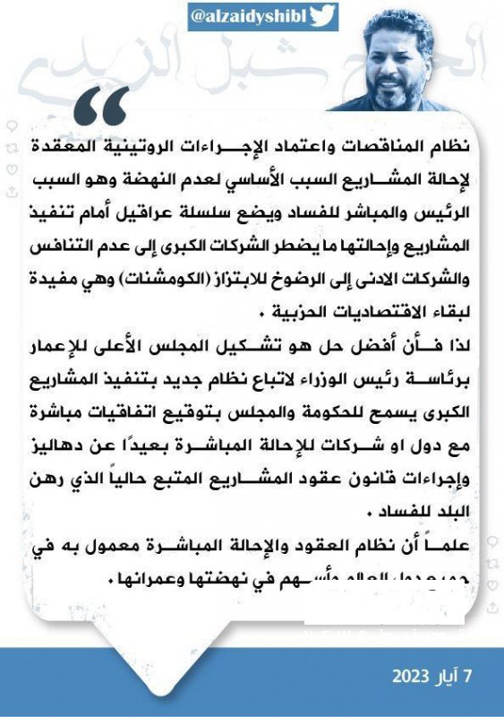 دعا الأمين العام لكتائب الإمام علي شبل الزيدي، الأحد، إلى تشكيل المجلس الأعلى للإعمار برئاسة رئيس الوزراء.
