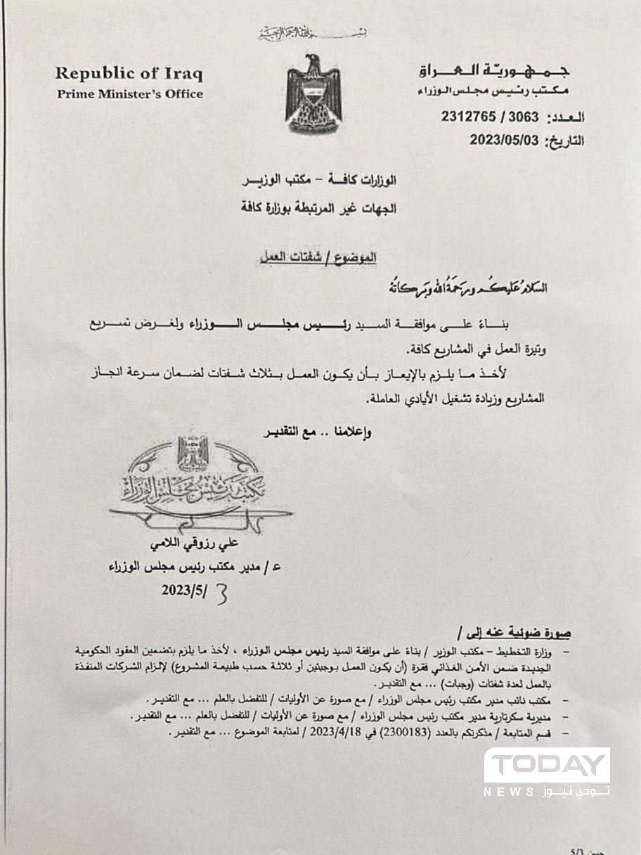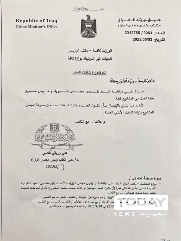 وبحسب كتاب صادر عن مكتب رئيس الوزراء ، أنه "وبناءً على موافقة رئيس الوزراء ولغرض تسريع وتيرة العمل في المشاريع كافة يلزم الايعاز بان يكون العمل بثلاث "شفتات" لضمان سرعة انجاز المشاريع وزيادة تشغيل الأيادي العاملة".