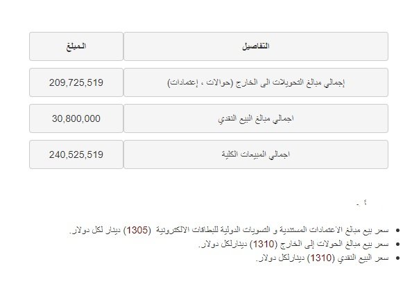 فيما "بلغ اجمالي مبالغ البيع النقدي 41,900,000 مليون دولار، واجمالي المبيعات الكلية بلغ 225,960,577 مليون دولار".