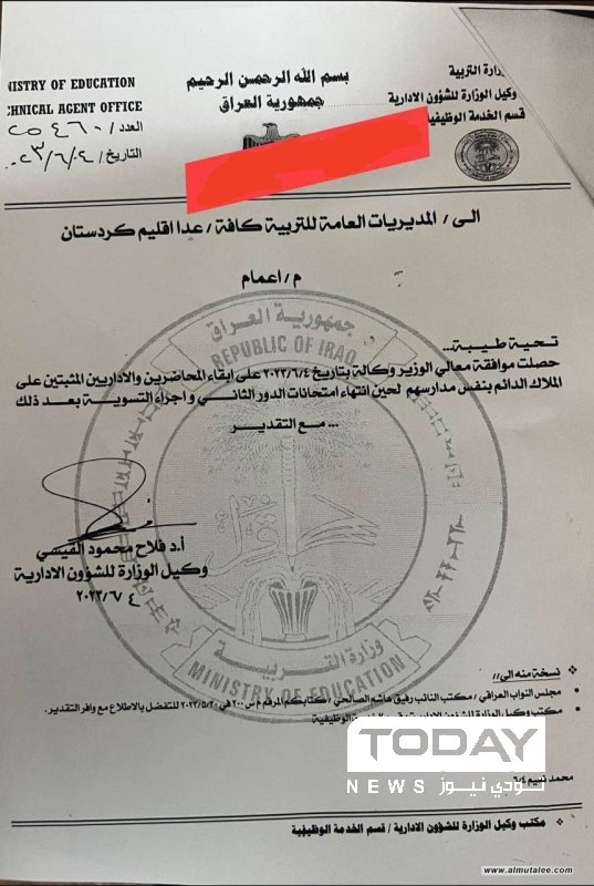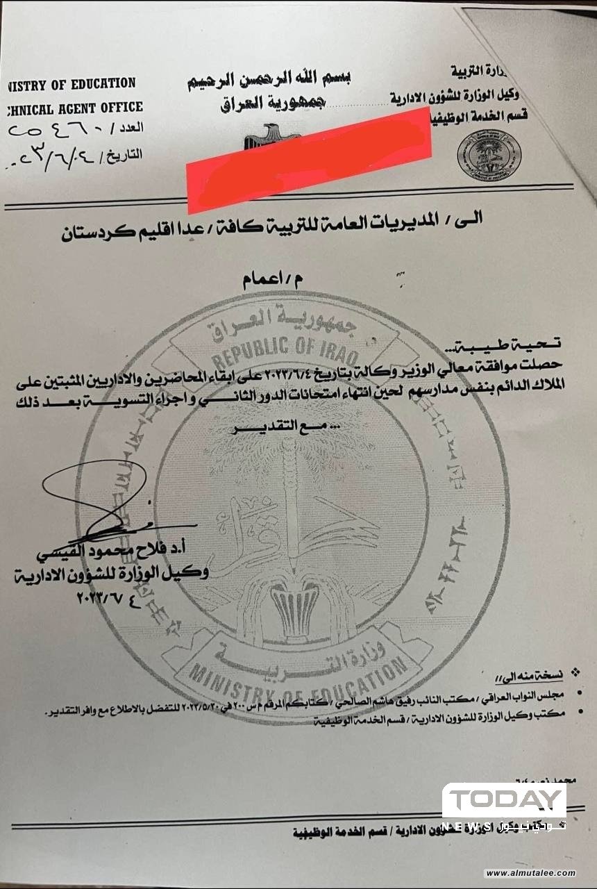 قررت وزارة التربية، الابقاء على المحاضرين والاداريين المثبتين على الملاك الدائم بنفس مدارسهم. وبحسب اعمام للوزارة، على نسخة منه فأنه تقرر "أبقاء المحاضرين والاداريين المثبتين على الملاك الدائم بنفس مدارسهم لحين انتهاء امتحانات الدور الثاني واجراء التسوية بعد ذلك".