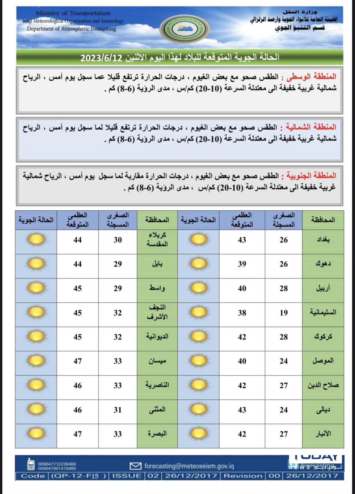 أعلنت الهيئة العامة للانواء الجوية والرصد الزلزالي، الاثنين، توقعاتها لحالة الطقس ودرجات الحرارة في عموم مناطق البلاد.