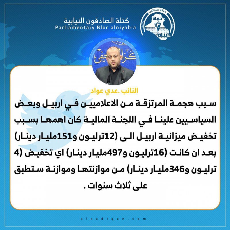 وقال عواد في تغريدة له ، ان" الهجمة التي تتعرض لها اللجنة المالية الى تخفيض حصة اربيل في الموازنة الثلاثية الى 12 مليون 151 مليار دينار"، مبينا ان" حصة اربيل كانت 16 ترليون و497 مليار دينار".