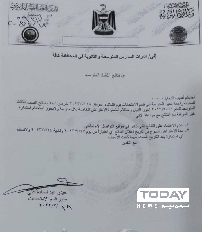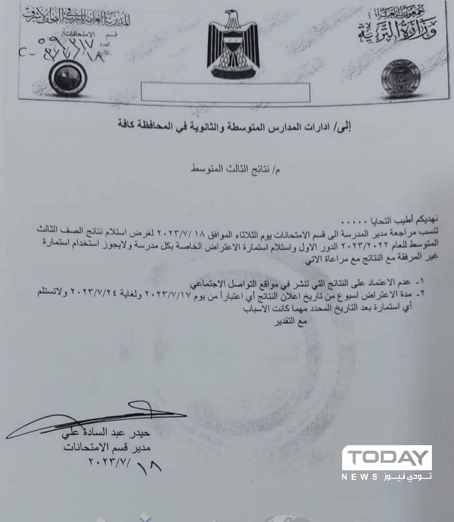 اعلنت وزارة التربية اليوم الثلاثاء، عن فتح باب الاعتراض على نتائج الثالث المتوسط لمدة اسبوع واحد فقط من ٧/١٧ لغاية ٧/٢٤ عن طريق ادارة المدرسة.