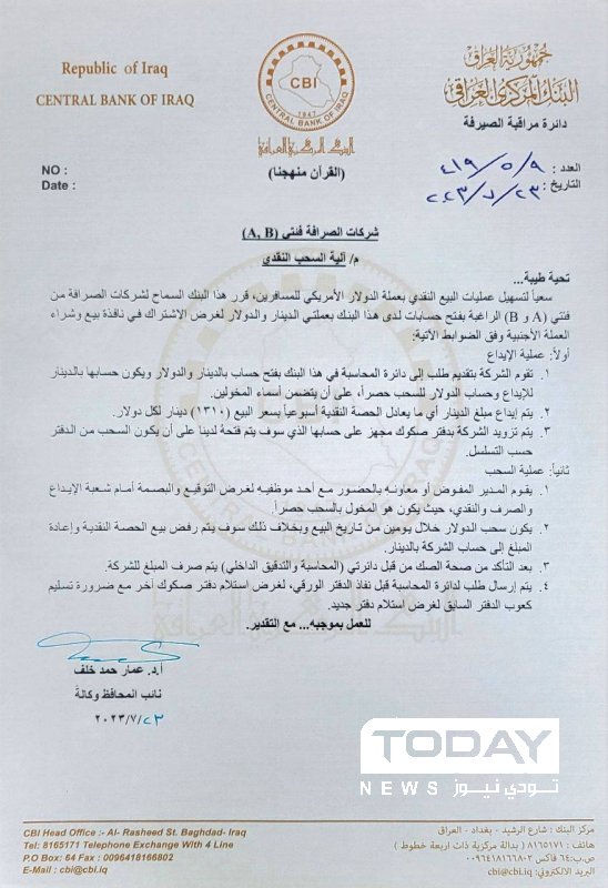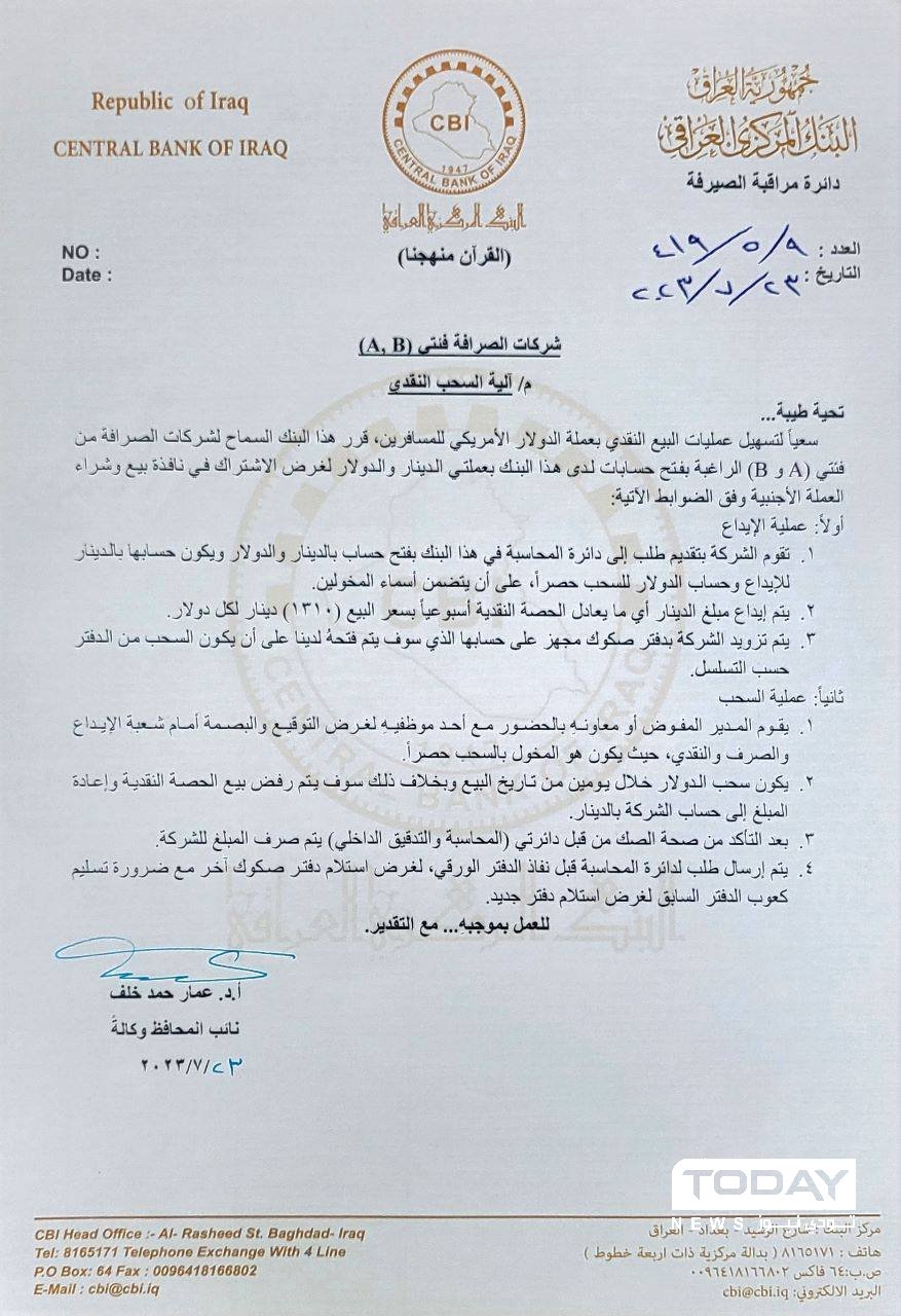 وجاء في وثيقة للبنك ، انه "سعياً لتسهيل عمليات البيع النقدي بعملة الدولار الأمريكي للمسافرين، قرر هذا البنك السماح لشركات الصرافة من فئتي (A و B الراغبة بفتح حسابات لدى هذا البنك بعملتي الدينار والدولار لغرض الاشتراك في نافذة بيع وشراء العملة الأجنبية وفق الضوابط الآتية: