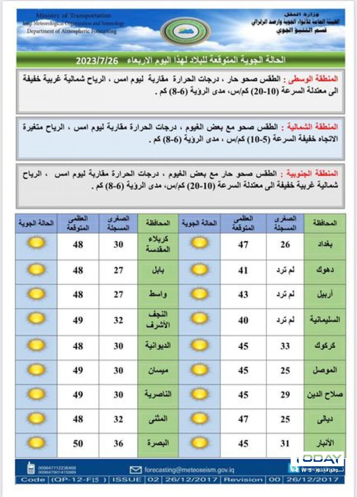 وقالت الهيئة، إن طقس اليوم سيكون صحوا مع بعض القطع من الغيوم في المناطق الشمالية والجنوبية، فيما تكون درجات الحرارة مقاربة لما سجلته يوم أمس في جميع مناطق البلاد وكما مبين في الجدول ادناه: