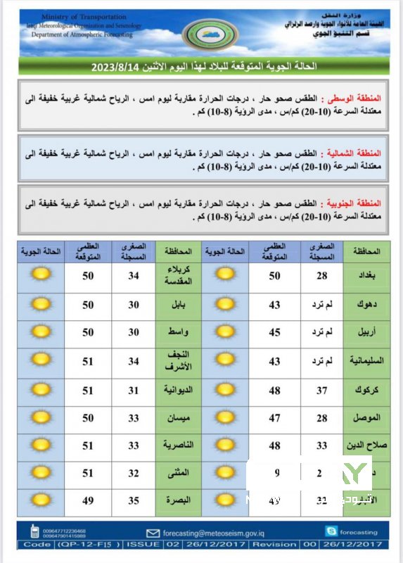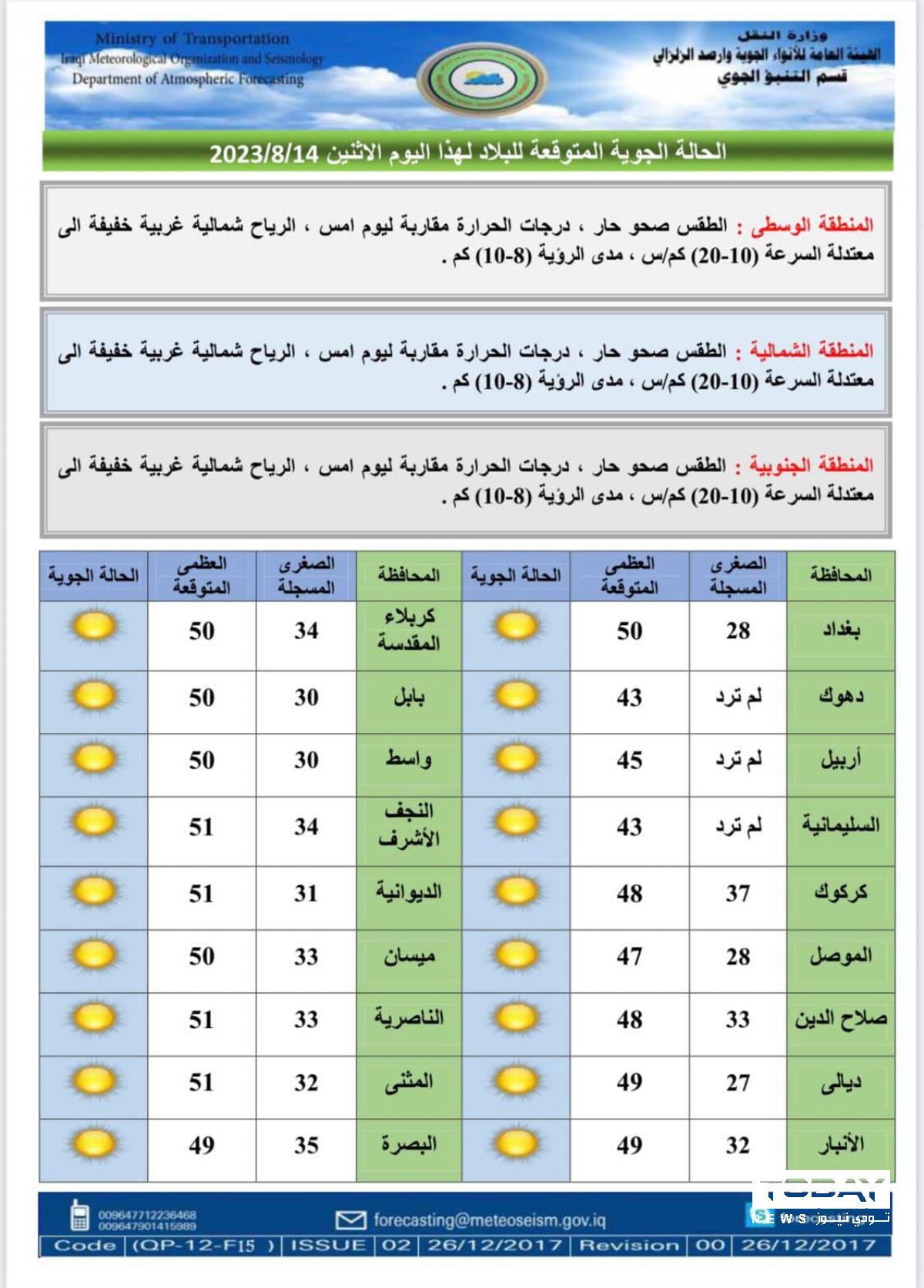 أعلنت الهيئة العامة للانواء الجوية والرصد الزلزالي، الأثنين، توقعاتها لحالة الطقس ودرجات الحرارة في عموم مناطق البلاد.