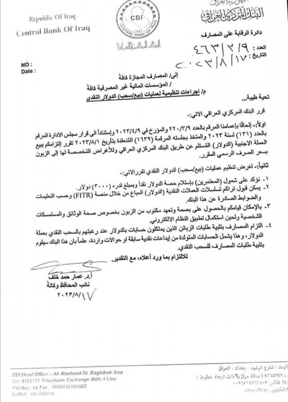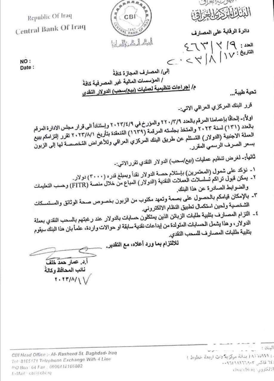 قرارات جديدة للمركزي العراقي بخصوص ببيع وسحب الدولار النقدي
