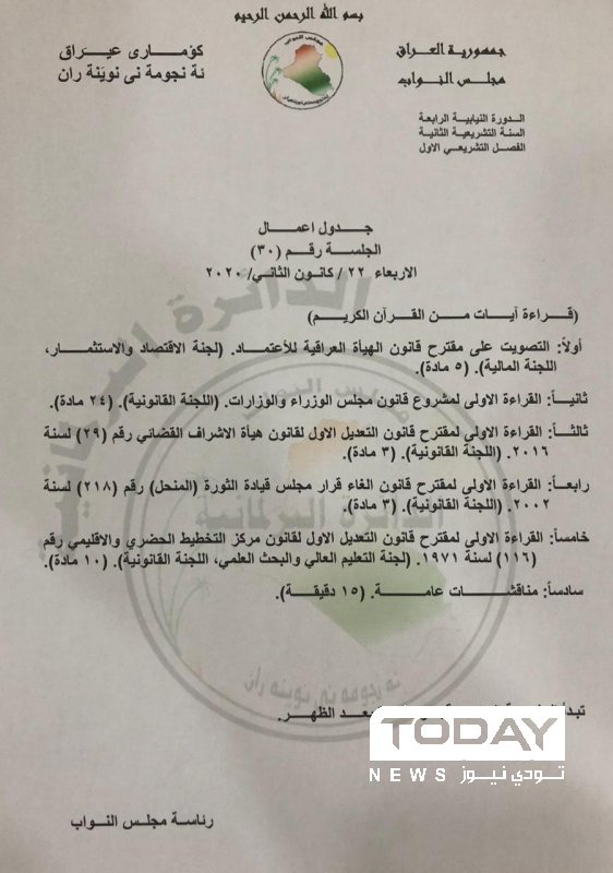 بالوثيقة.. جدول اعمال جلسة البرلمان اليوم