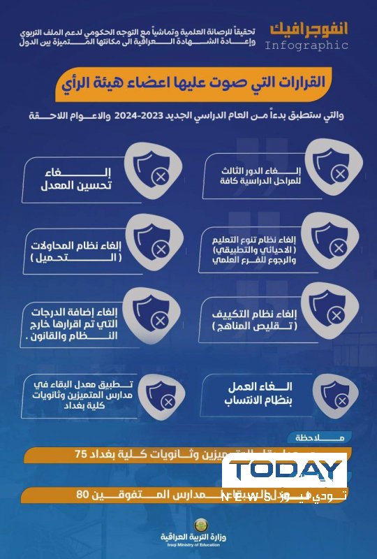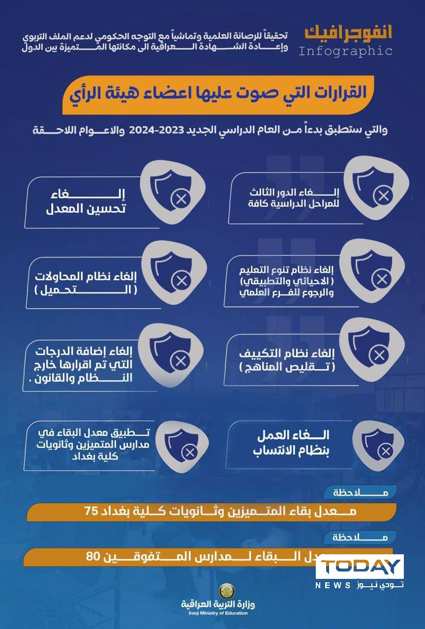 وأفاد بيان للوزارة ، أنه "تحقيقا للرصانة العلمية وتماشيا مع التوجه الحكومي لدعم الملف التربوي وإعادة الشهادة العراقية الى مكانتها المتميزة بين الدول ونظرا لكثرة الاستفسارات الواردة الى وزارة التربية تم اعادة نشر القرارات التي صوت عليها اعضاء هيئة الرأي والتي ستطبق بدءا من العام الدراسي الجديد 2023-2024 والاعوام اللاحقة"، وهي :- - إلغاء الدور الثالث للمراحل الدراسية كافة.- إلغاء نظام الانتساب.- إلغاء تحسين المعدل - إلغاء نظام تنوع التعليم ( الاحيائي والتطبيقي) والرجوع الى الفرع العلمي والادبي فقط.- إلغاء نظام المحاولات ( التحميل).- إلغاء نظام التكييف (تقليص المناهج).- إلغاء إضافة الدرجات التي تم اقرارها خارج النظام والقانون.- تطبيق معدل البقاء في مدارس المتميزين وثانويات كلية بغداد