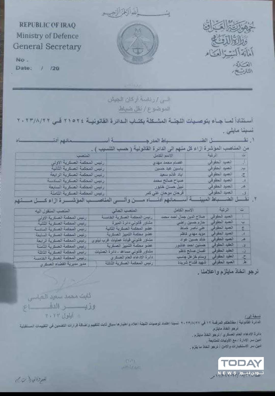 ويأتي ذلك، استناداً إلى ما جاء في توصيات اللجنة المشكلة بكتاب الدائرة القانونية يوم 22 آب 2023، بحسب وثيقة صادرة عن أمانة سر وزارة الدفاع ومرسلة الى رئاسة أركان الجيش، حصلت وكالة شفق نيوز على نسخة منها.