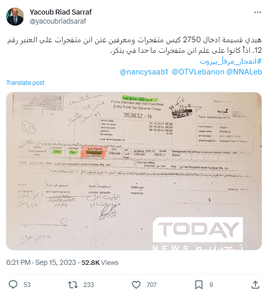 وعبر حسابه على موقع "إكس"، نشر الصراف وثيقة تُظهر إدخال كمية ضخمة من المتفجرات (2750 كيسا) إلى مرفأ بيروت، وتحديدا إلى العنبر رقم 12.