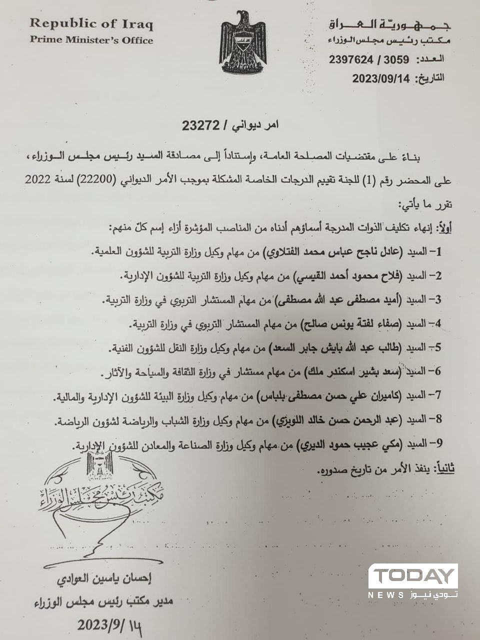 وثيقة.. السوداني ينهي تكليف 9 مستشارين ووكلاء وزارات
