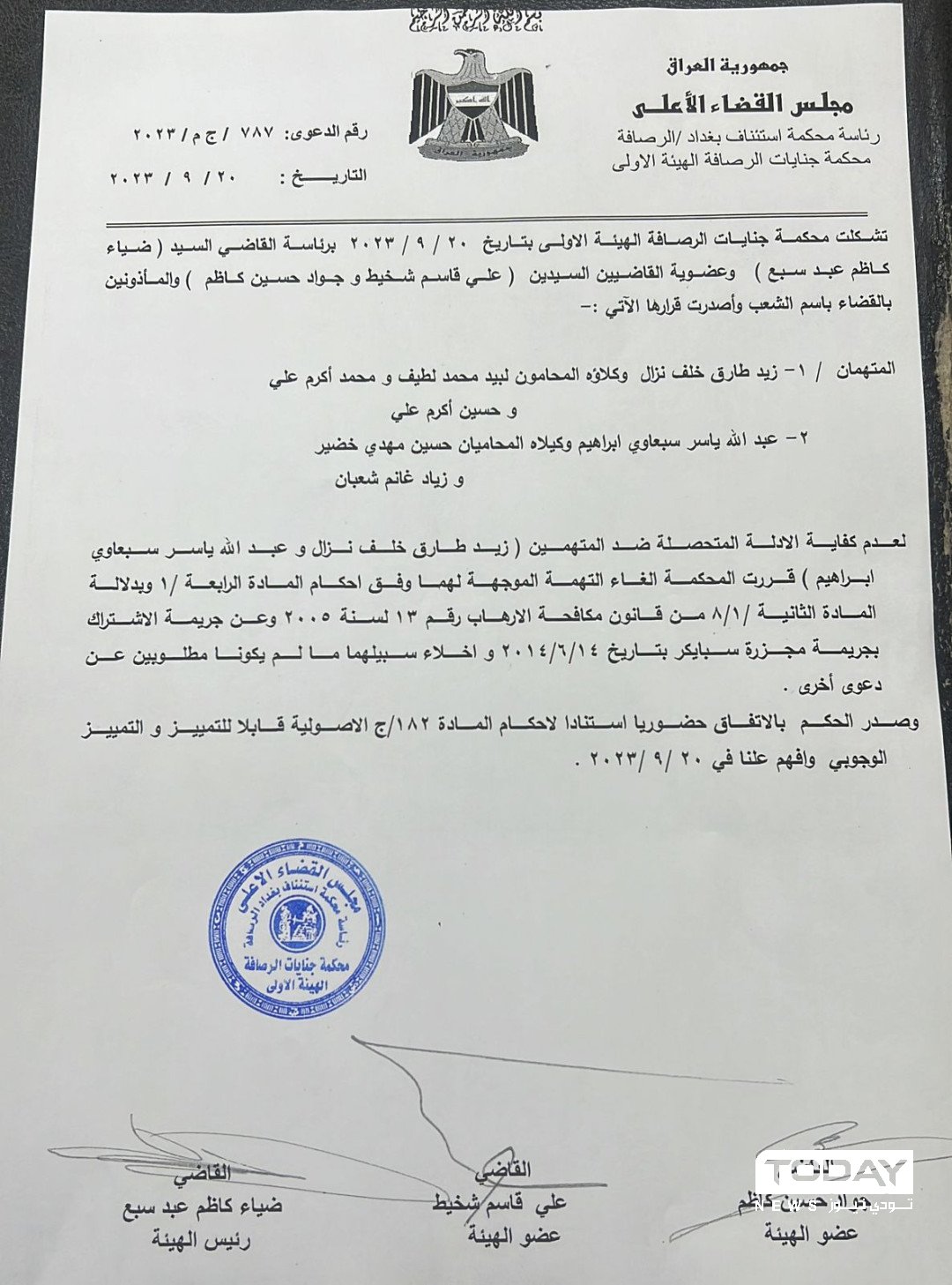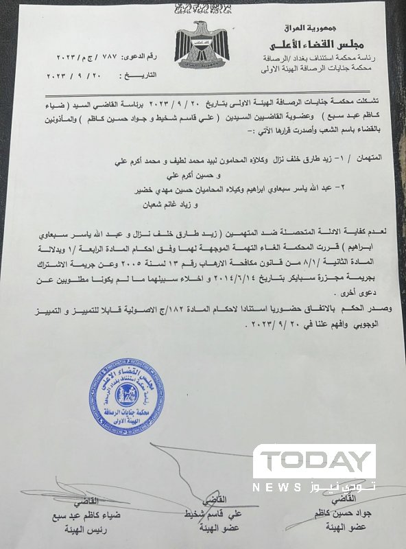 كما قررت المحكمة أيضا تبرئة نجل طارق عزيز من جريمة مجزرة سبايكر عام 2014، وذلك بحسب وثيقة رسمية كشف عنها النقاب اليوم السبت.