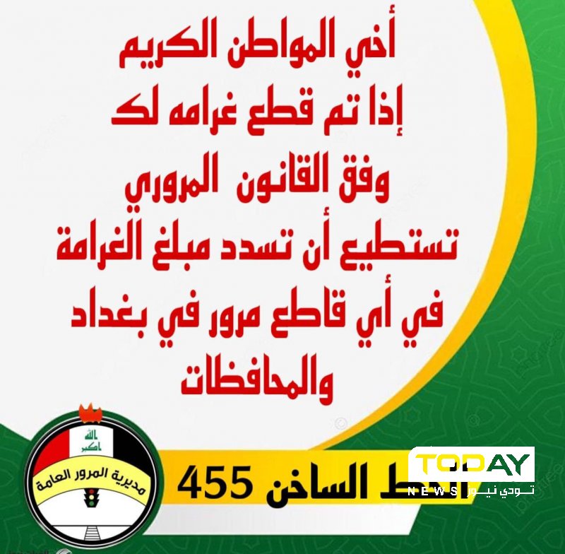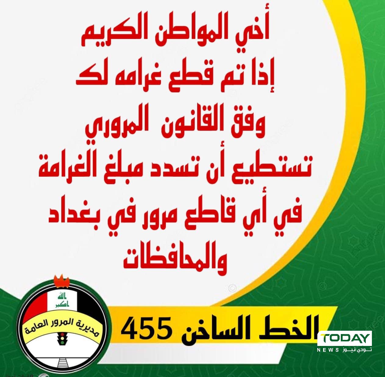اعلنت مديرية المرور العامة، اليوم السبت، إمكانية تسديد الغرامات المرورية في أي قاطع ببغداد والمحافظات .