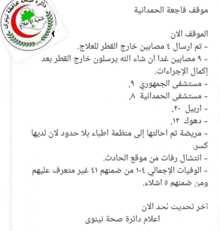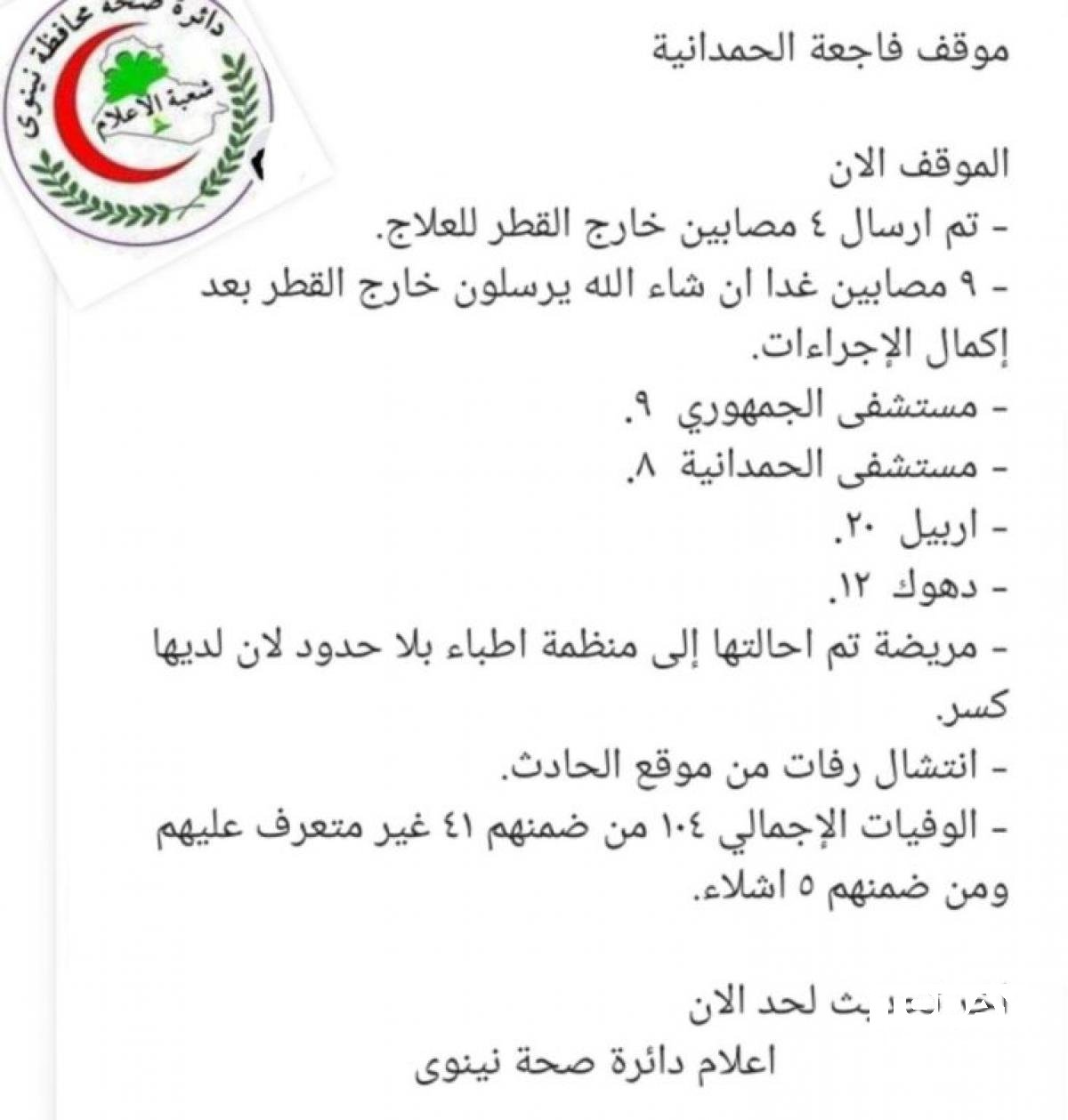 صحة نينوى: ارتفاع حصيلة فاجعة الحمدانية إلى 104 ضحايا
