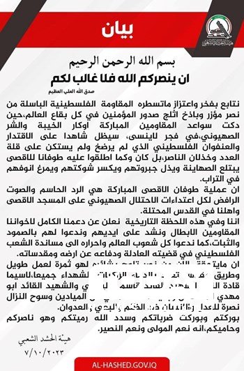 الحشد: طوفان الأقصى هي الرد الحاسم والصوت الرافض لكل الاعتداءات الصهيونية