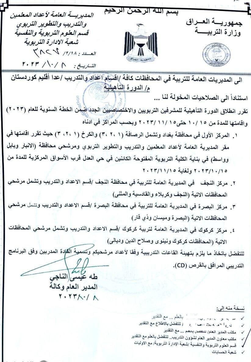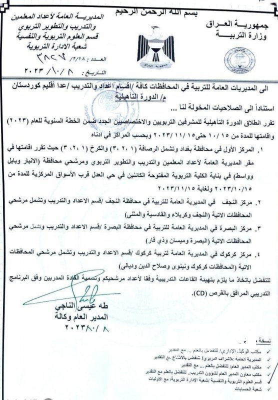حددت وزارة التربية، الخامس عشر من تشرين الاول الحالي موعداً لانطلاق الدورة التأهيلية للمشرفين التربويين والاختصاصيين الجدد ضمن الخطة السنوية للعام 2023.