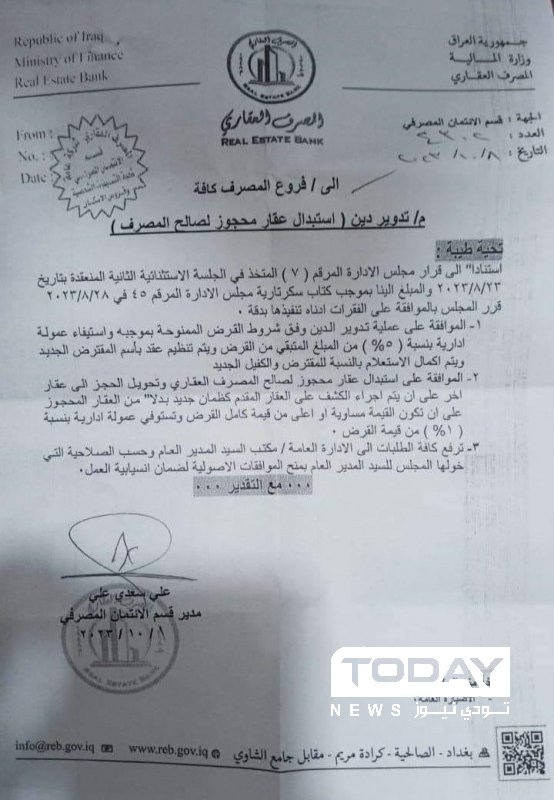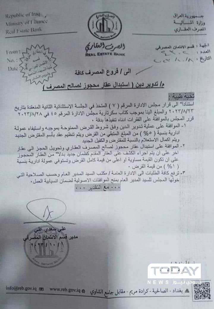 وجاء في وثيقة موقعة من مدير قسم الائتمان المصرفي علي سعد علي وموجهة إلى فروع المصرف، ان مجلس ادارة المصرف قرر الموافقة على عملية تدوير الدين وفق شروط القرض الممنوح بموجبه واستيفاء عمولة إدارية بنسبة 5% من المبلغ المتبقي من القرض، ويتم تنظيم عقد باسم المقترض الجديد ويتم اكمال الاستعلام بالنسبة للمقترض والكفيل الجديد.
