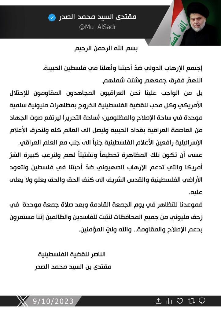 الصدر يدعو إلى تظاهرة مليونية في ساحة التحرير لنصرة القضية الفلسطينية