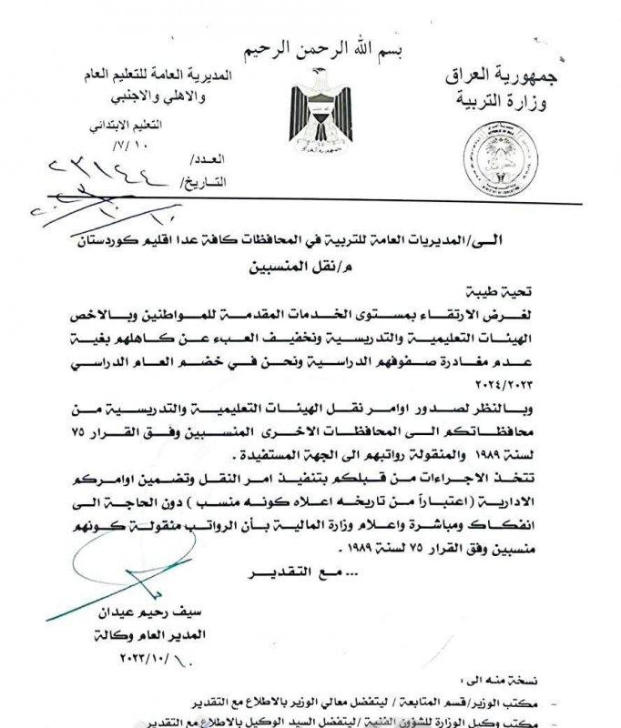 اصدرت وزارة التربية، اليوم الاثنين، توجيها الى مديرياتها بخصوص نقل المنسبين من محافظاتهم الى المحافظات الاخرى.