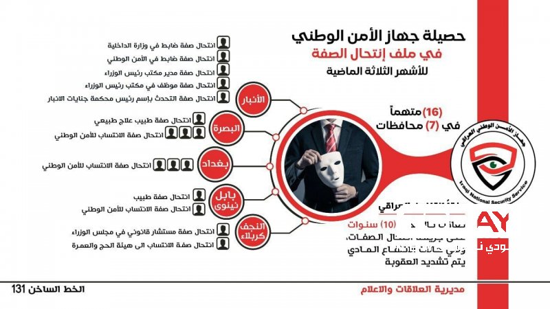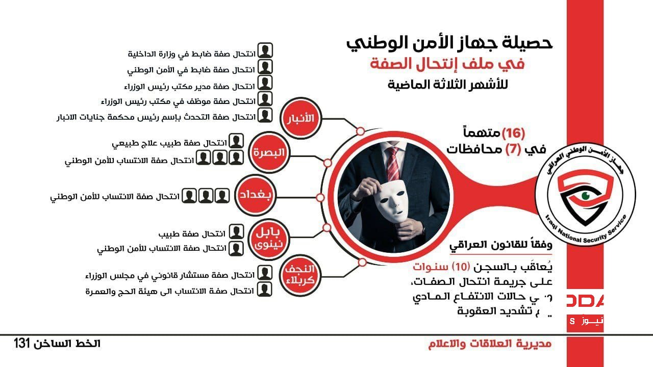 وذكر الجهاز في بيان تلقت TodayNews نسخة منه، أنه"يواصل عملياته النوعية في ملاحقة المجرمين والخارجين عن القانون ومنهم أولئك الذين يمارسون عمليات النصب والإحتيال وإستغلال المواطنين بانتحالهم صفات رسمية متعددة بُغية تحقيق مكاسب مالية غير مشروعة، حيث تمكنت مفارزنا وبعد جهود استخبارية وكمائن محكمة من الإطاحة بـ (١٦) متهماً بانتحال الصفة من أبرزهم منتحل صفة نائب مدير مكتب رئيس الوزراء، وآخر انتحل صفة مستشار قانوني في رئاسة الوزراء".