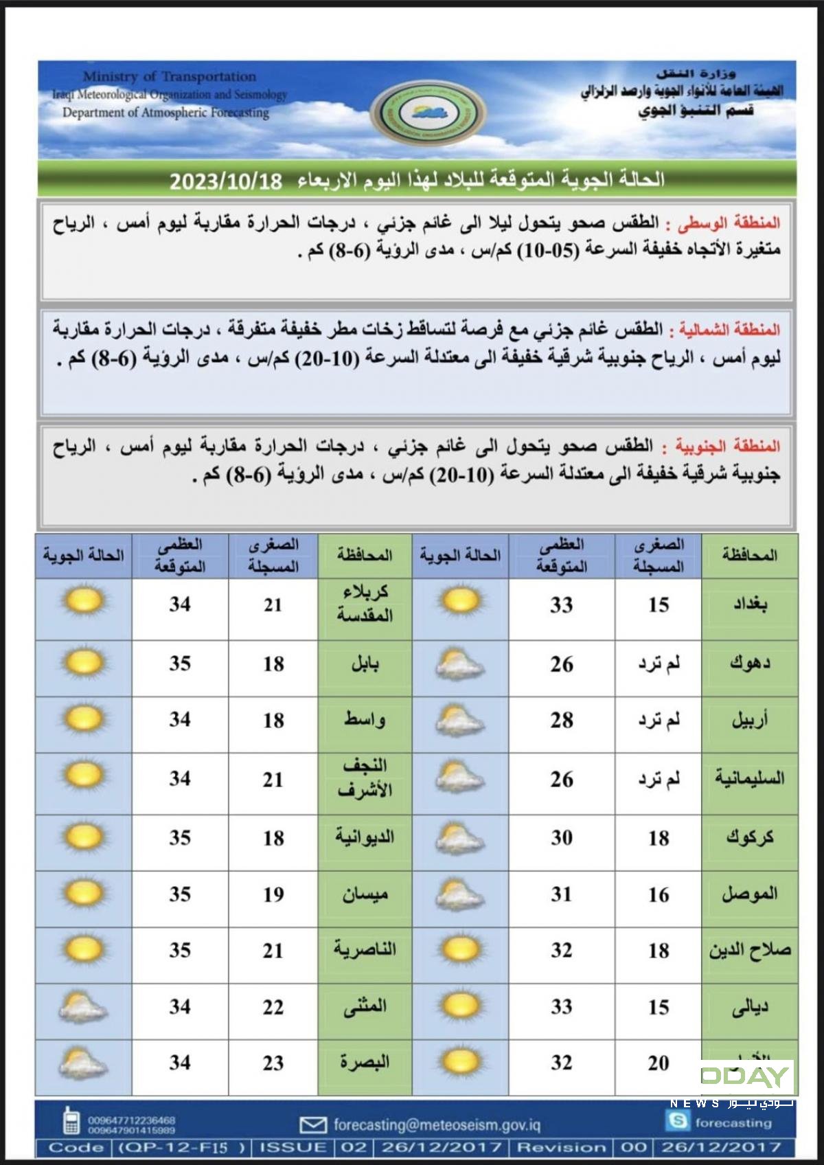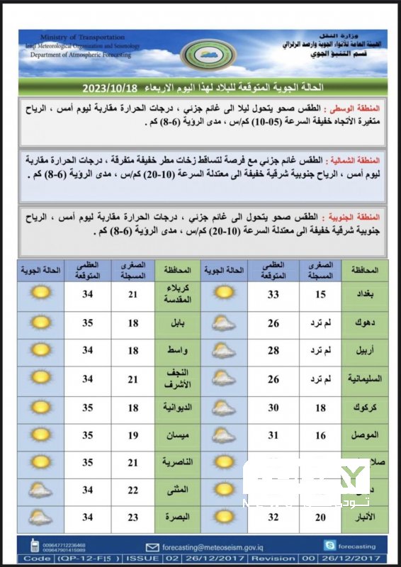 طقس العراق ودرجات الحرارة المتوقعة لليوم الأربعاء