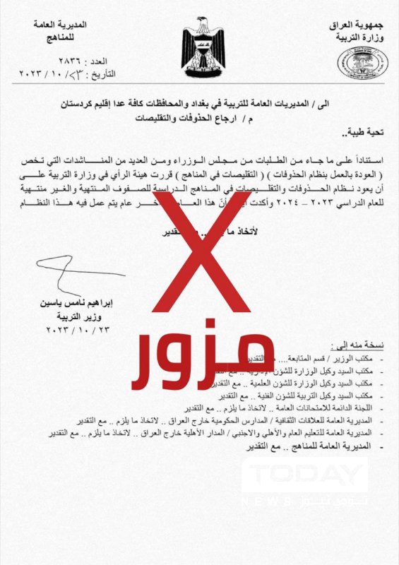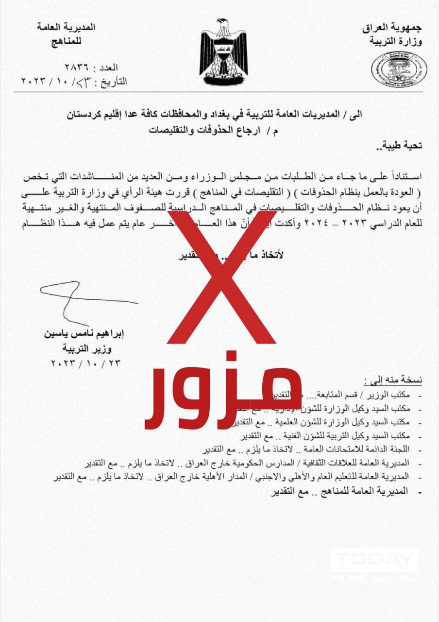 نفت وزارة التربية، اليوم الاثنين، كتاباً مزوراً يخص إعادة العمل بنظام الحذوفات والتقليصات.