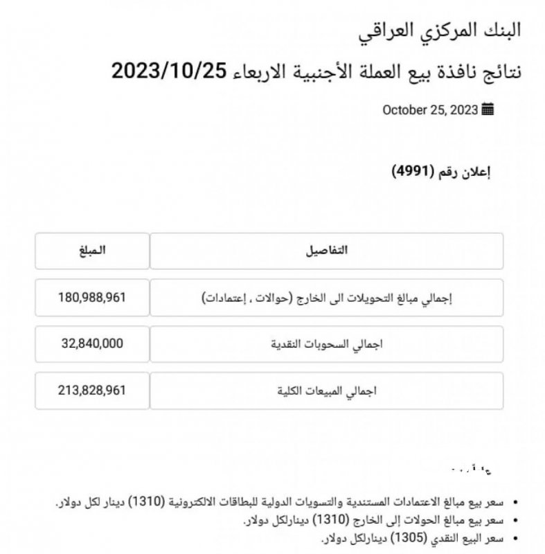 المركزي العراقي يبيع أكثر من 210 مليون دولار بمزاد اليوم