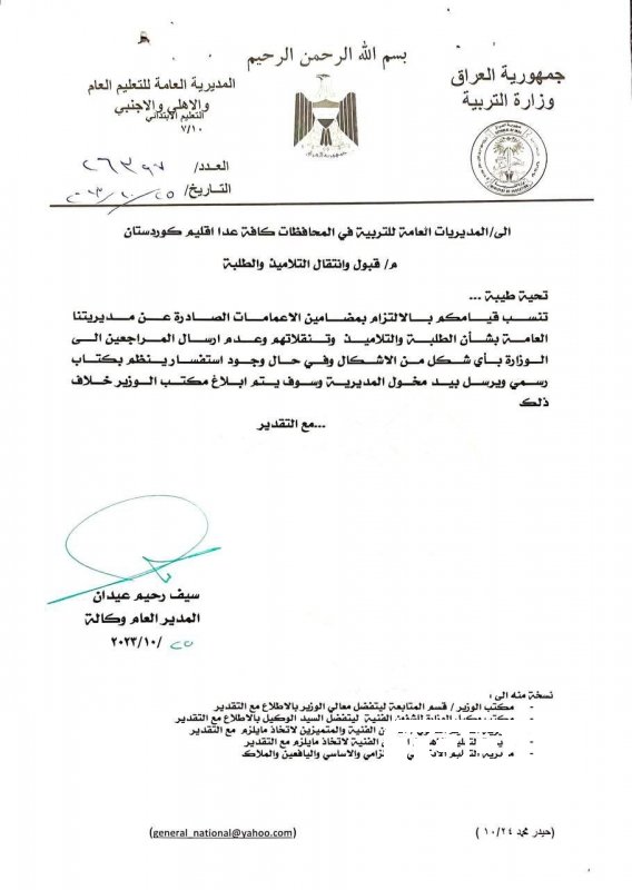 وأشارت الى "عدم إرسال المراجعين الى الوزارة وتكبيدهم عناء الطريق وبأي شكل من الأشكال وفي حال وجود اي استفسار فيتم عن طريق مخول المديرية وبكتاب رسمي".