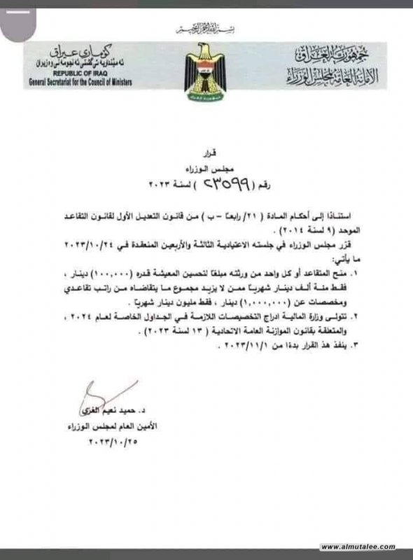 وذكرت وثيقة صادرة من الأمانة العامة بتاريخ 25 - تشرين الأول، أنه: "استنادا إلى أحكام المادة (21 رابعا - ب) من قانون التعديل الأول لقانون التقاعد الموحد (9) لسنة 2014، قرر مجلس الوزراء في جلسته الاعتيادية الثالثة والأربعين المنعقدة في 24 -10-2023 ما يأتي: